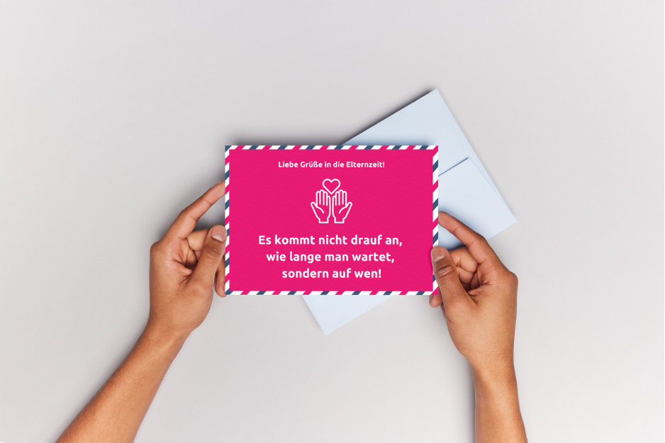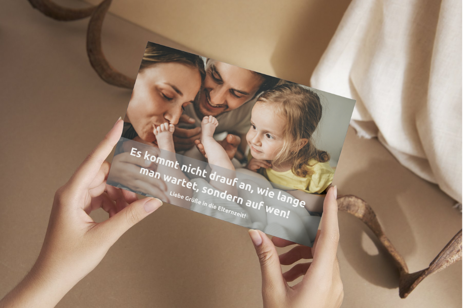 Wähle zwischen dem Familien-Motiv oder dem modernen Design. Beide Karten tragen die Botschaft – „Es kommt nicht drauf an, wie lange man wartet, sondern auf wen!“ – perfekt, um zu zeigen, dass an die frischgebackenen Eltern bzw. Mitarbeitenden gedacht wird.